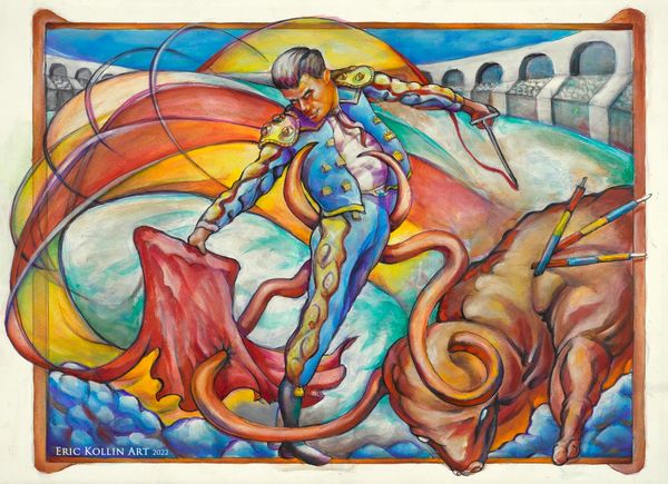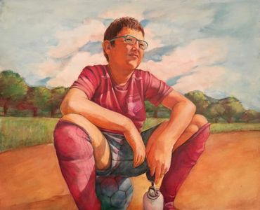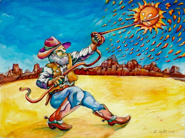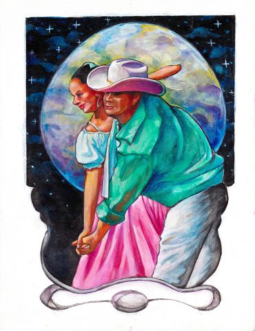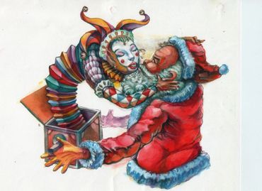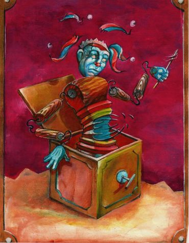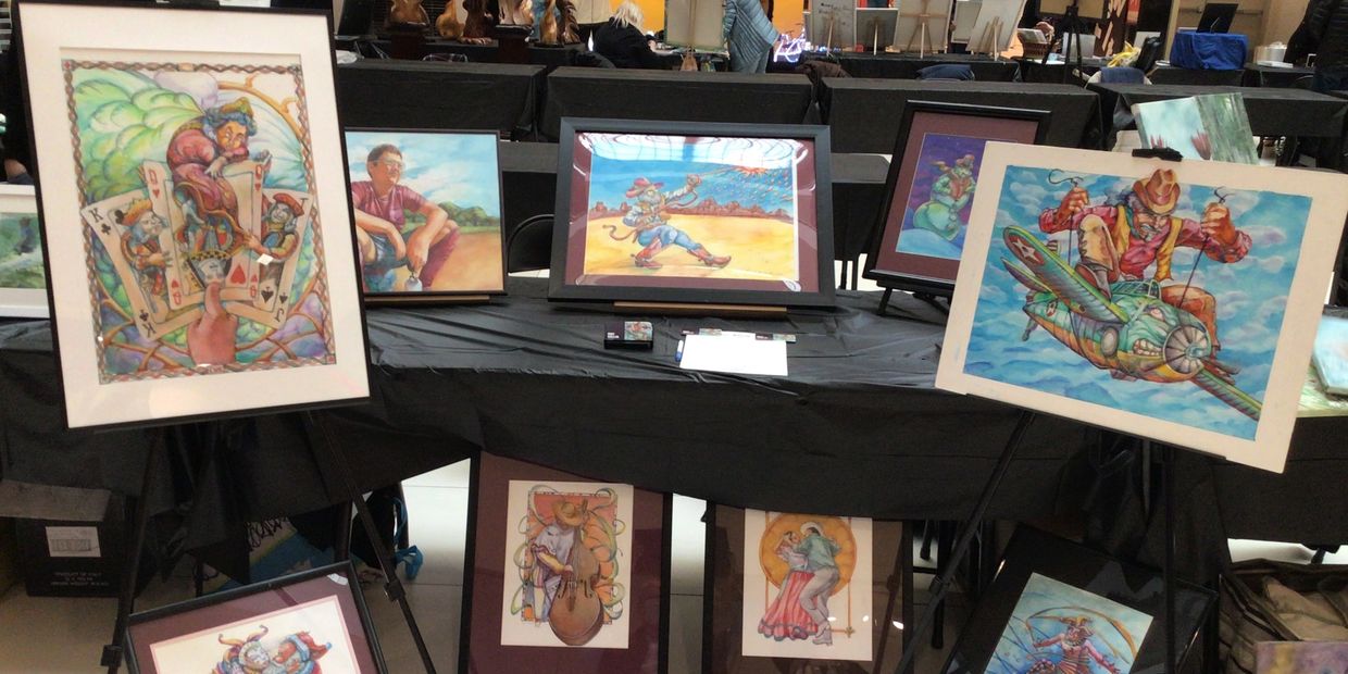 Although my work may often look like watercolor, my primary medium is Acrylics on Illustration Board or Canvas Board. The ideas usually start as a napkin sketch. I enlarge that sketch in order to retain the spontaneity, and then I delve into reference materials and items, for more emotional and physical accuracy. My studio can be a corner of a room, a cafe, a park, or wherever he can put down pencils and paints. I feels that the environment and process can become as important as the outcome.